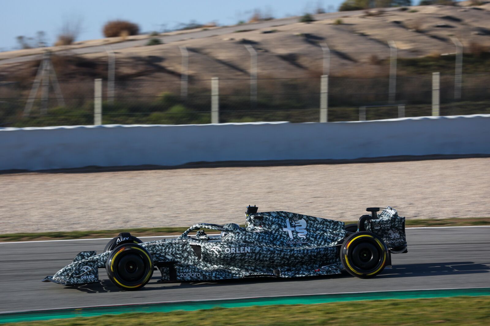Az Alfa Romeo hivatalosan még nem mutatta be idei autóját, így álcafestéssel vesz részt a teszten, hogy ne legyenek kivehetők az autó vonásai.